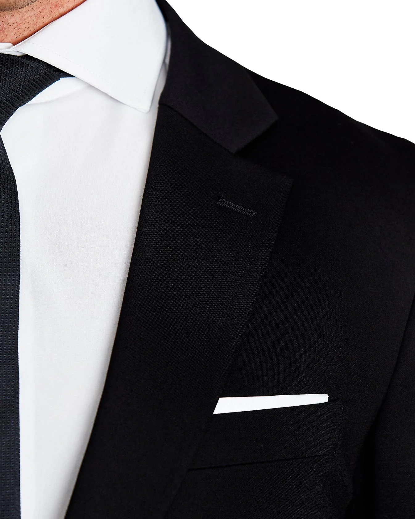 Our black stretch blazer is crafted from a performance fabric blend that is extremely stretchy while still providing an incredibly professional appearance. They are lined with our dress shirt fabric making them lightweight, breathable and moisture-wicking. It also features our signature athletic fit that rewards those with an athletic physique.