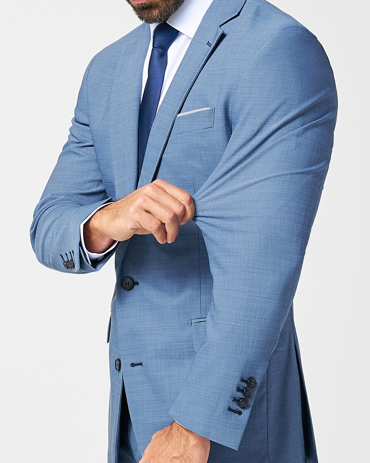 Our light blue stretch suit is crafted from a performance fabric blend that is both extremely stretchy and provides an incredibly professional appearance. The suits are lined with our dress shirt fabric, making them lightweight, breathable, and moisture-wicking. This suit comes in our signature athletic fit that rewards those with an athletic physique.