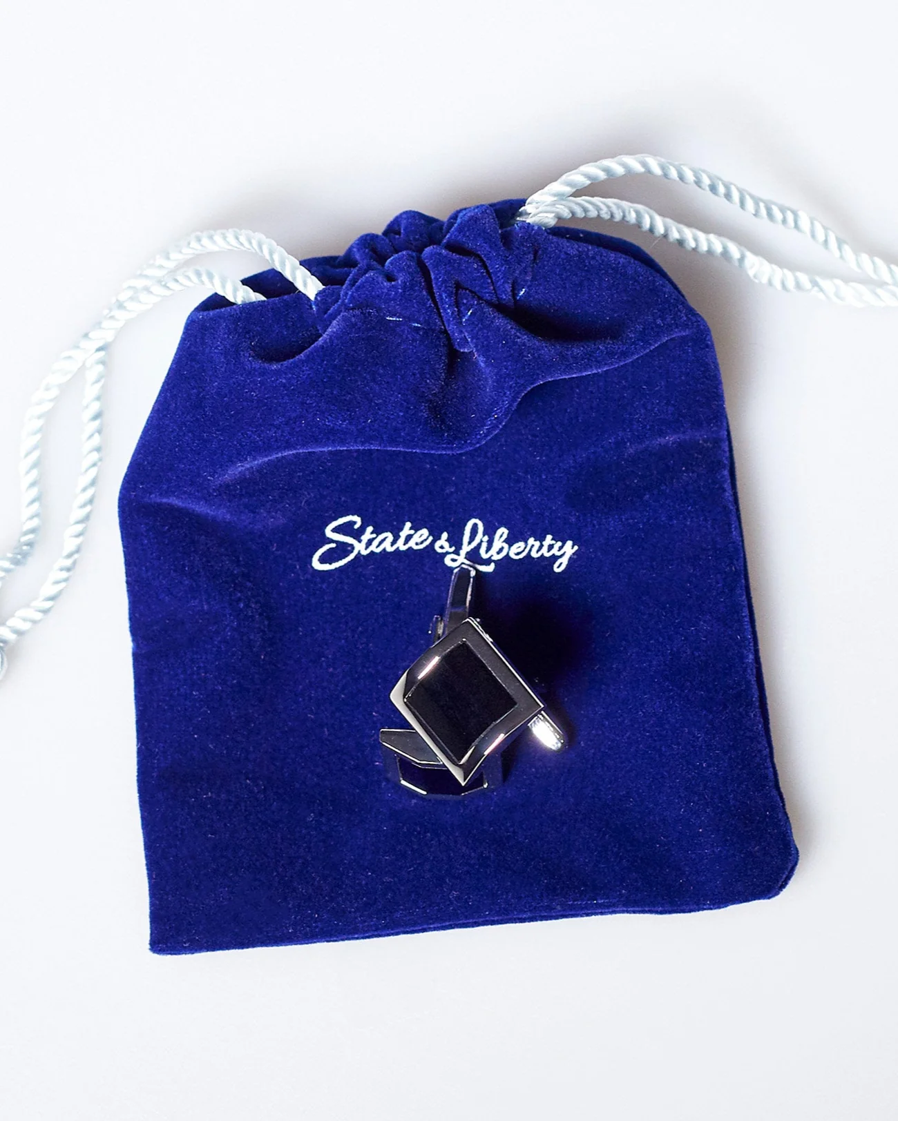 These sharp square cuff links are crafted from steel with a black onyx face.