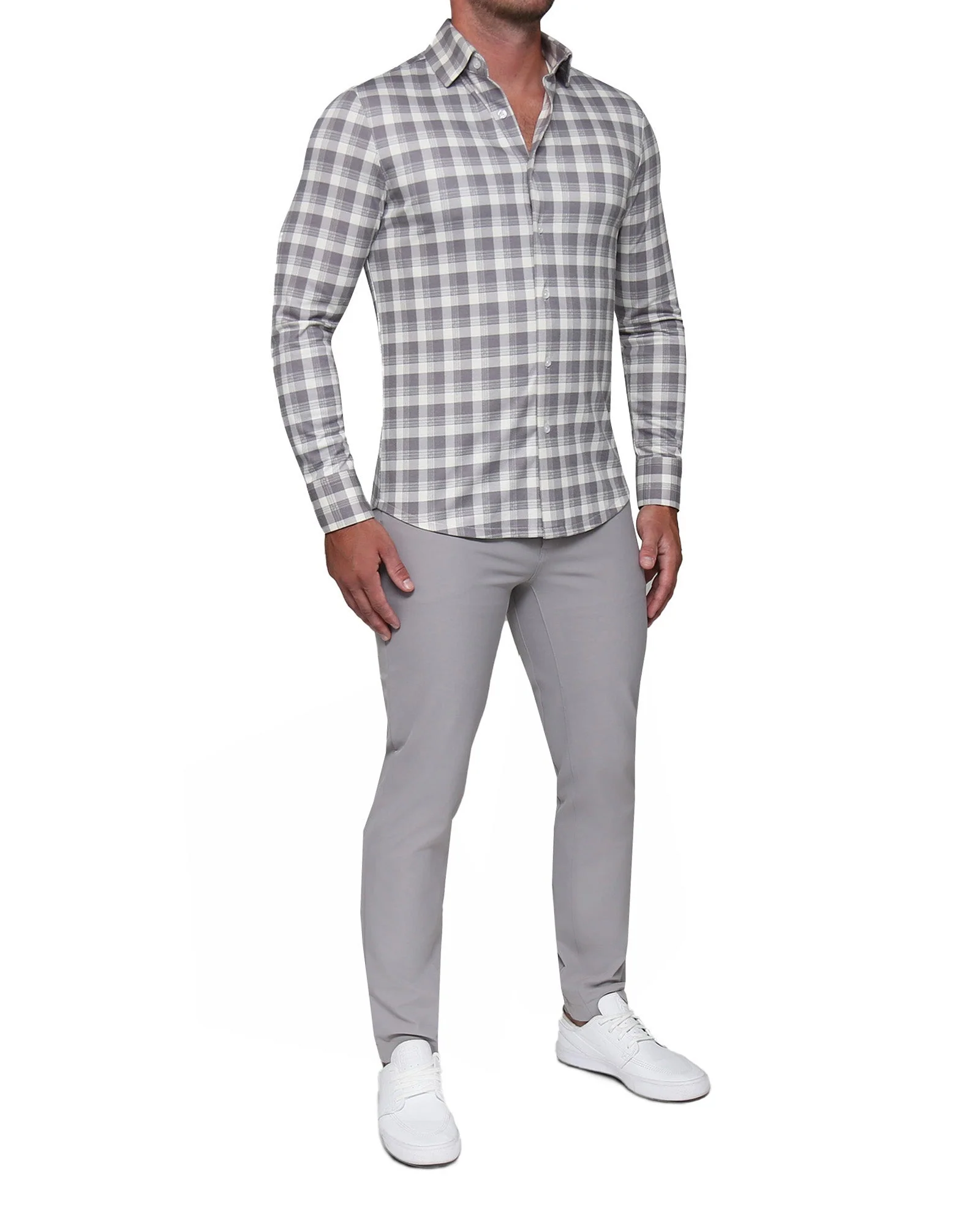 A true athletic fit casual button down crafted from a soft-brushed polyester-spandex blend, this grey plaid button down is as stretchy and comfortable as it gets. Featuring shortened length and a curved hemline, this shirt is guaranteed to have you comfortable and sharp for both casual wear and a great night out.